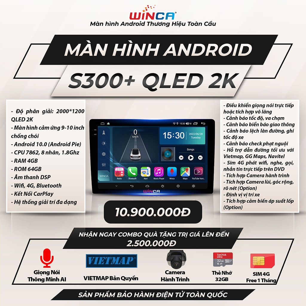 Màn hình ôtô thông minh tương thích với 3 loại bản đồ dẫn đường tiên tiến nhất hiện nay là: Vietmap S1, Google Maps, Navitel. Trên màn hình Android Winca S300+ QLED 2K đã tích hợp sẵn phần mềm bản quyền Vietmap S1 cho phép tìm đường không phụ thuộc vào internet, cảnh báo tốc độ kịp thời, cảnh báo biển báo giao thông, cảnh báo camera phạt nguội, hỗ trợ tài xế lái xe an toàn. Ngoài ra, 2 loại bản đồ còn lại là Google Maps và Navitel hỗ trợ người dùng cảnh báo những điểm nóng kẹt xe, chọn tuyến đường nhanh và an toàn nhất, hỗ trợ nâng cấp cập nhật phần mềm trọn đời.
